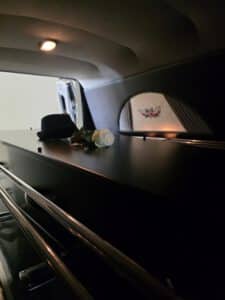 Op de dag van de uitvaart reed ik naar het uitvaartcentrum. Zijn hoed legde ik op de kist, samen met de witte roos die hij wenste. Daarna plaatsten we hem in de zwarte rouwauto en reden we naar zijn woonlocatie, waar de andere bewoners klaarstonden. In een stoet, met zwarte volgauto’s, reden we naar de begraafplaats. Zijn muziek klonk. Er werd gesproken. Iedereen had één witte roos bij zich om bij hem neer te leggen. Een klein, intiem afscheid. Met respect voor wie hij was.